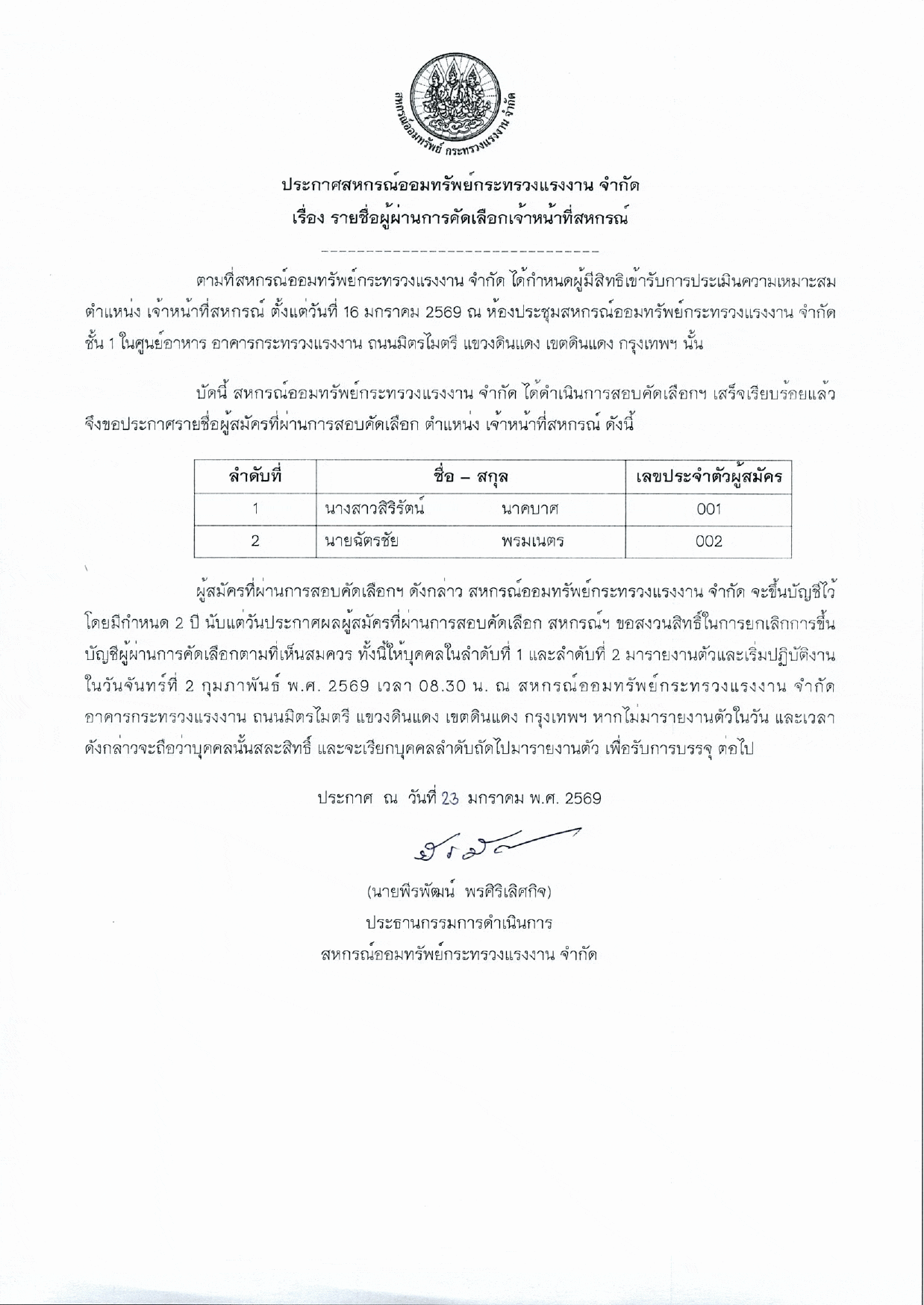 รายชื่อผู้ผ่านการคัดเลือกเจ้าหน้าที่สหกรณ์