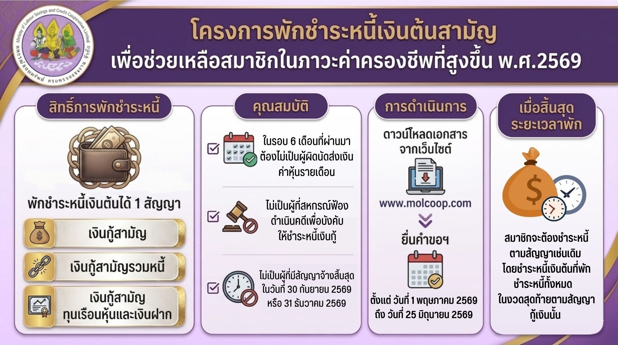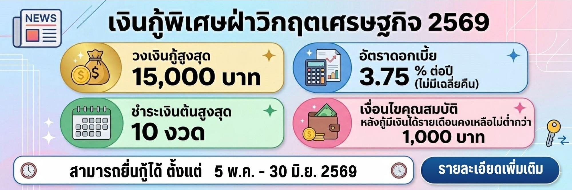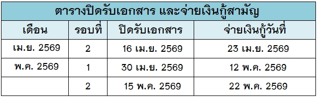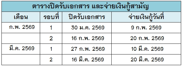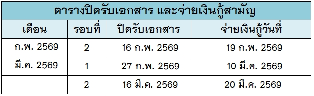 - ส่งคืนเงินกู้ภายในระยะเวลา 30 งวด นัับตั้งแต่วันที่กู้ครั้งสุดท้าย (ไม่ต้องต่อสัญญา)