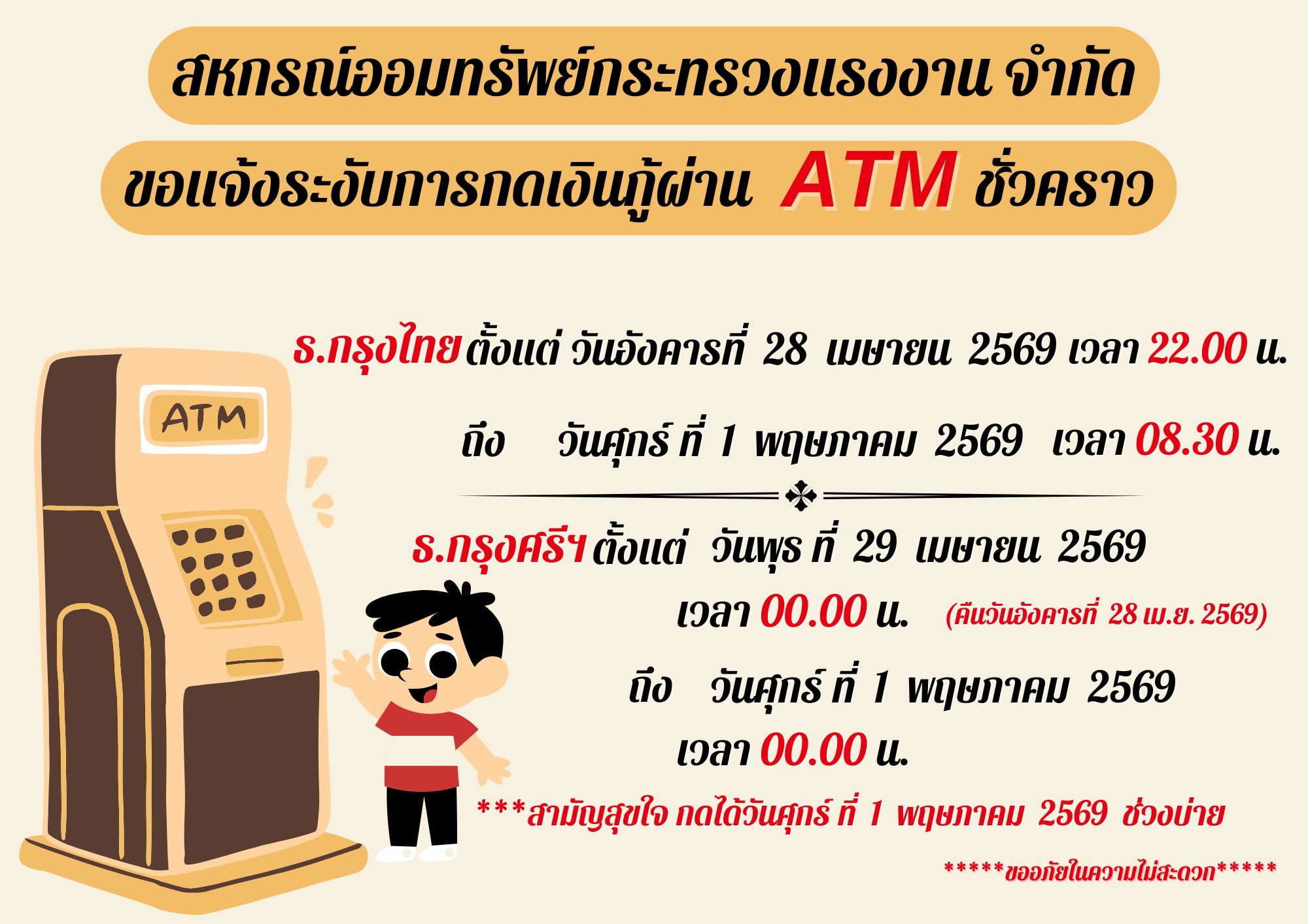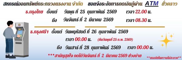 - สมาชิกต้องมีบัตร ATM และกดกู้เงินกับตู้ ATM