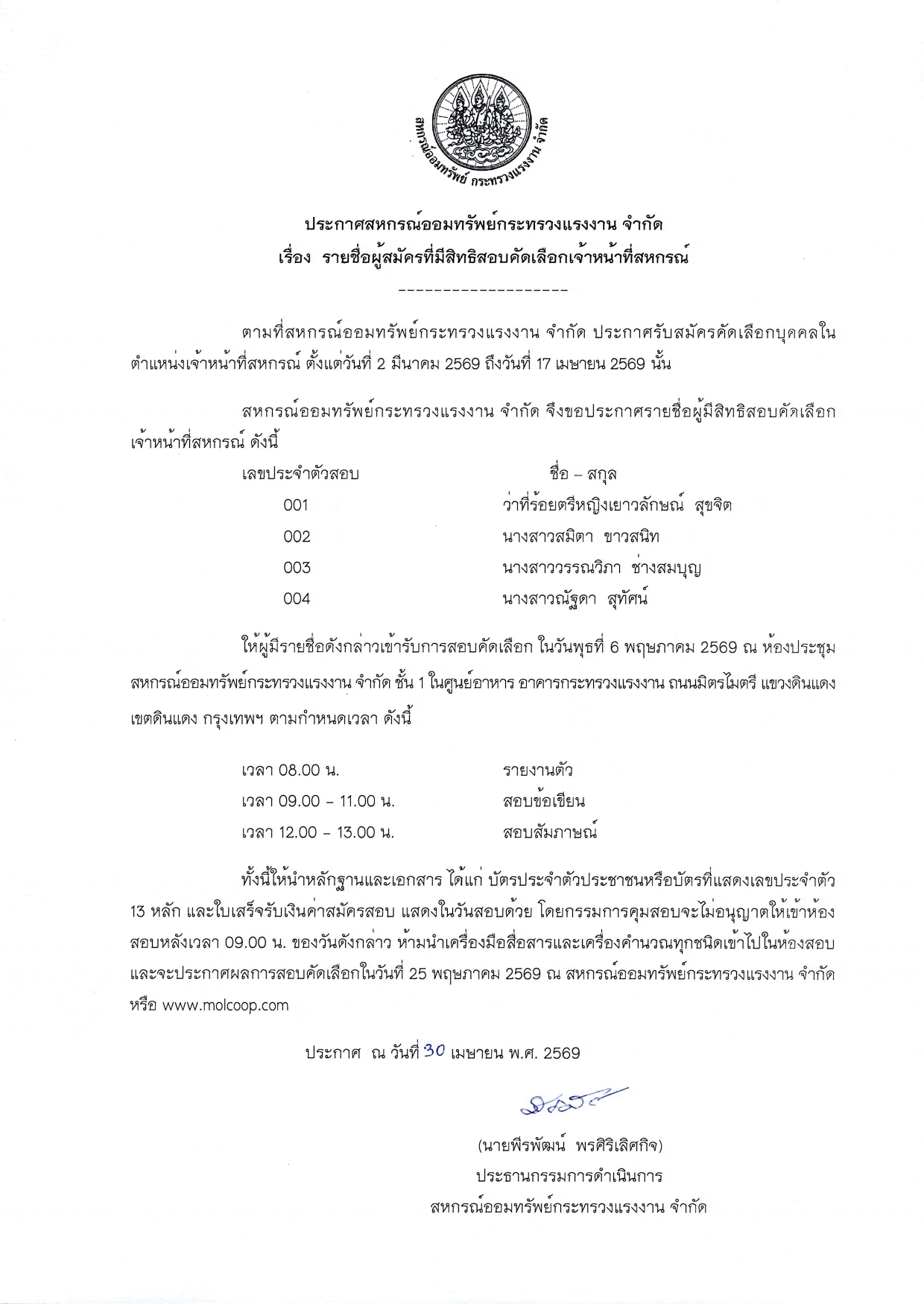 รายชื่อผู้สมัครที่มีสิทธิสอบคัดเลือกเจ้าหน้าที่สหกรณ์
